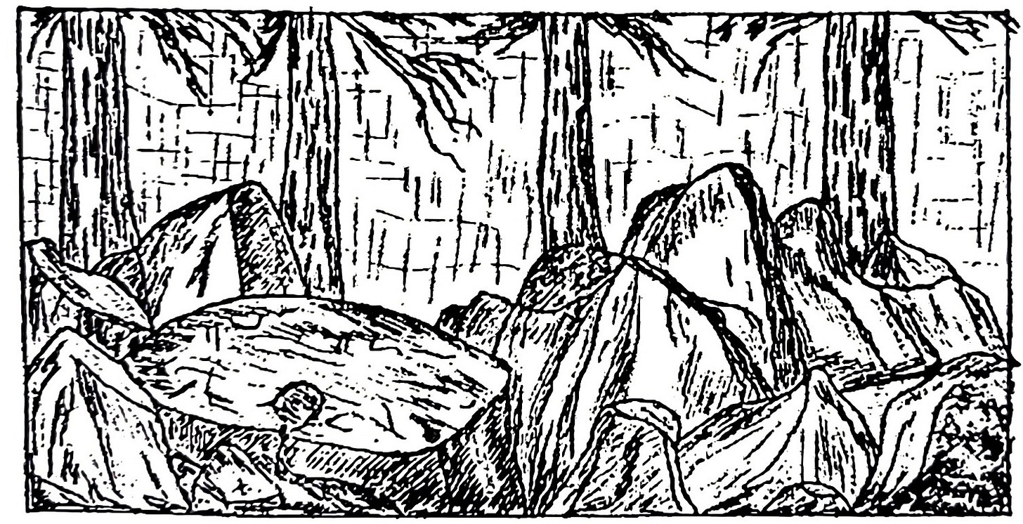 The exercise was now over; he stood close to the abyss. The fight had to be taking place to his left, but in that direction, only a few meters away, stood a large rock block, probably about seven meters high, which was unclimbable. On one side it jutted out a good distance over the abyss, while on the other side it leaned against the steep rock wall, leaving only a very narrow gap of a few centimeters. Erdfried wedged his fingers into the gap, hoping in this way to be able to climb up quietly. After about two meters in height the gap became narrower and the rock block even smoother than it already was. At that point his feet could no longer hold him — and he fell. His hands were bleeding, his knee hurt, and yet he attempted the climb once more. It was, after all, the only way to get across.