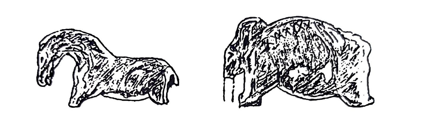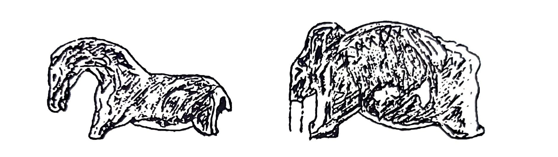 In the vicinity of Heidenheim in the Swabian Alb, a cave was uncovered in 1931 that, along with remains of mammoth and rhinoceros, contained ten ivory figures of prehistoric animals. The creator of this oldest art treasure on German soil is believed to have lived in the earlier Stone Age, more than 20,000 years ago. The two illustrated pieces depict a wild horse and a mammoth (with broken-off trunk).